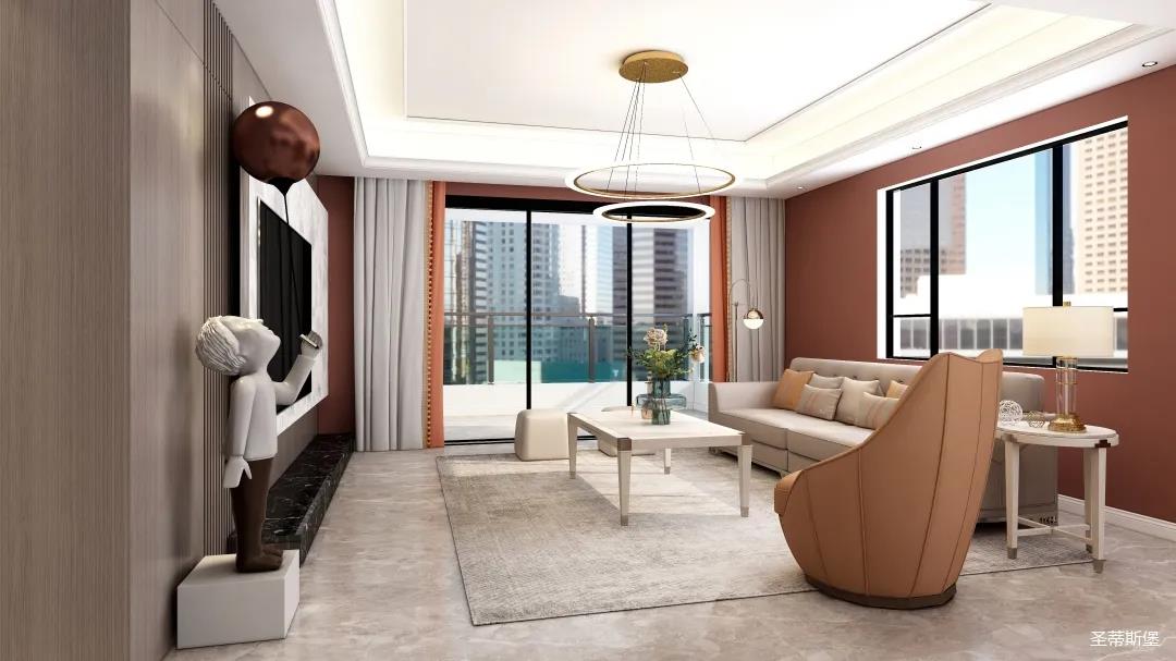 表姐不喜欢大白墙设计,于是设计师完美贴合表姐的喜好,摒弃了传统的大白墙,将色彩跳跃的铁锈红应用于空间,从视觉上丰富了空间的层次感。南北通透的空间布局,让视野更为清透明亮。